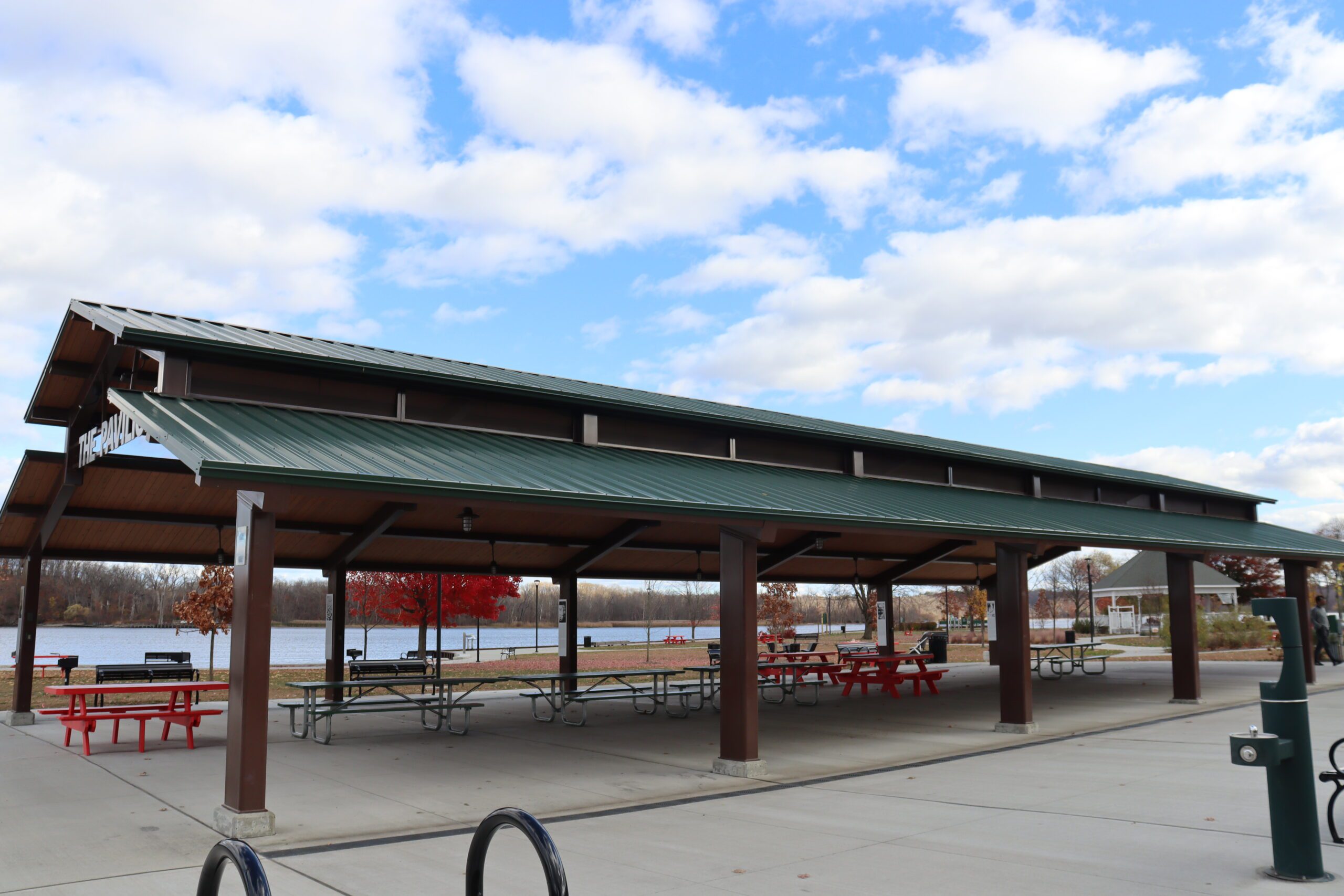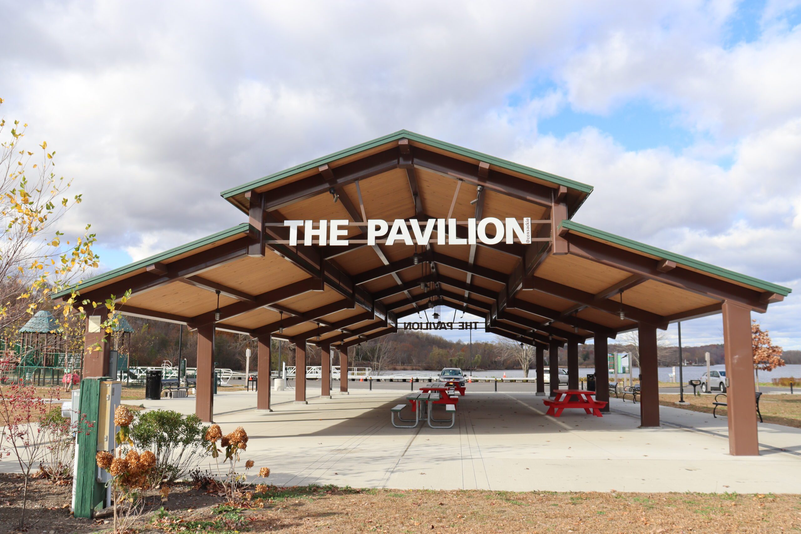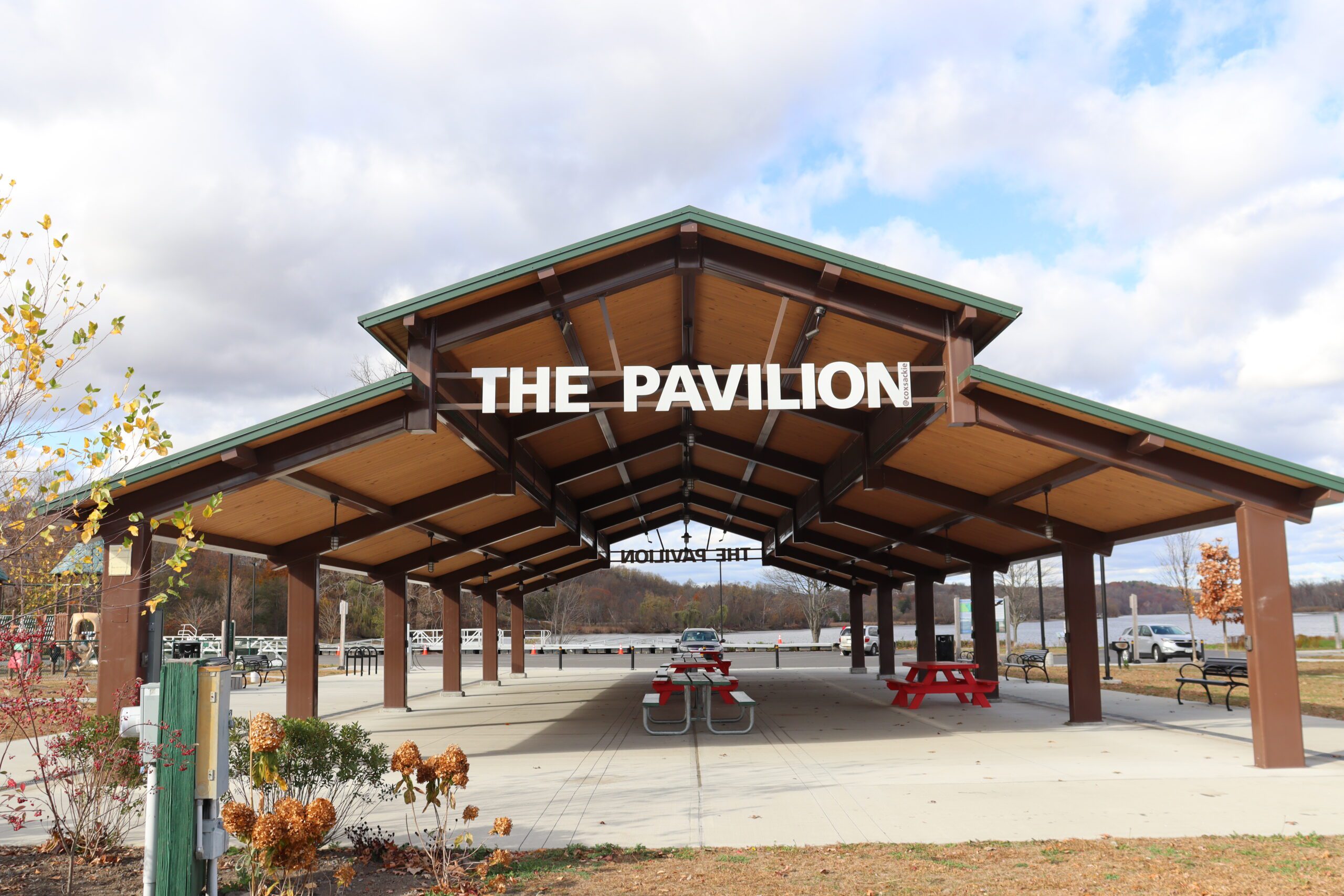 It offers visitors a shaded space to rest, gather, or take in the waterfront views. This structure provides both function and form—delivering reliable protection from the elements while complementing the natural surroundings of the boat launch area. Whether used by boaters, picnickers, or community members enjoying a day by the water, the shelter serves as a central and inviting amenity